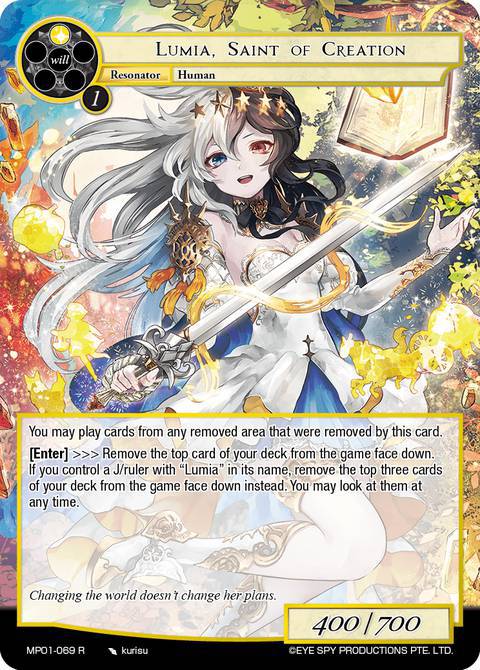 >>> Remove the top card of your deck from the game face down. If you control a J/ruler with "Lumia" in its name, remove the top three cards of your deck from the game face down instead. You may look at them at any time.